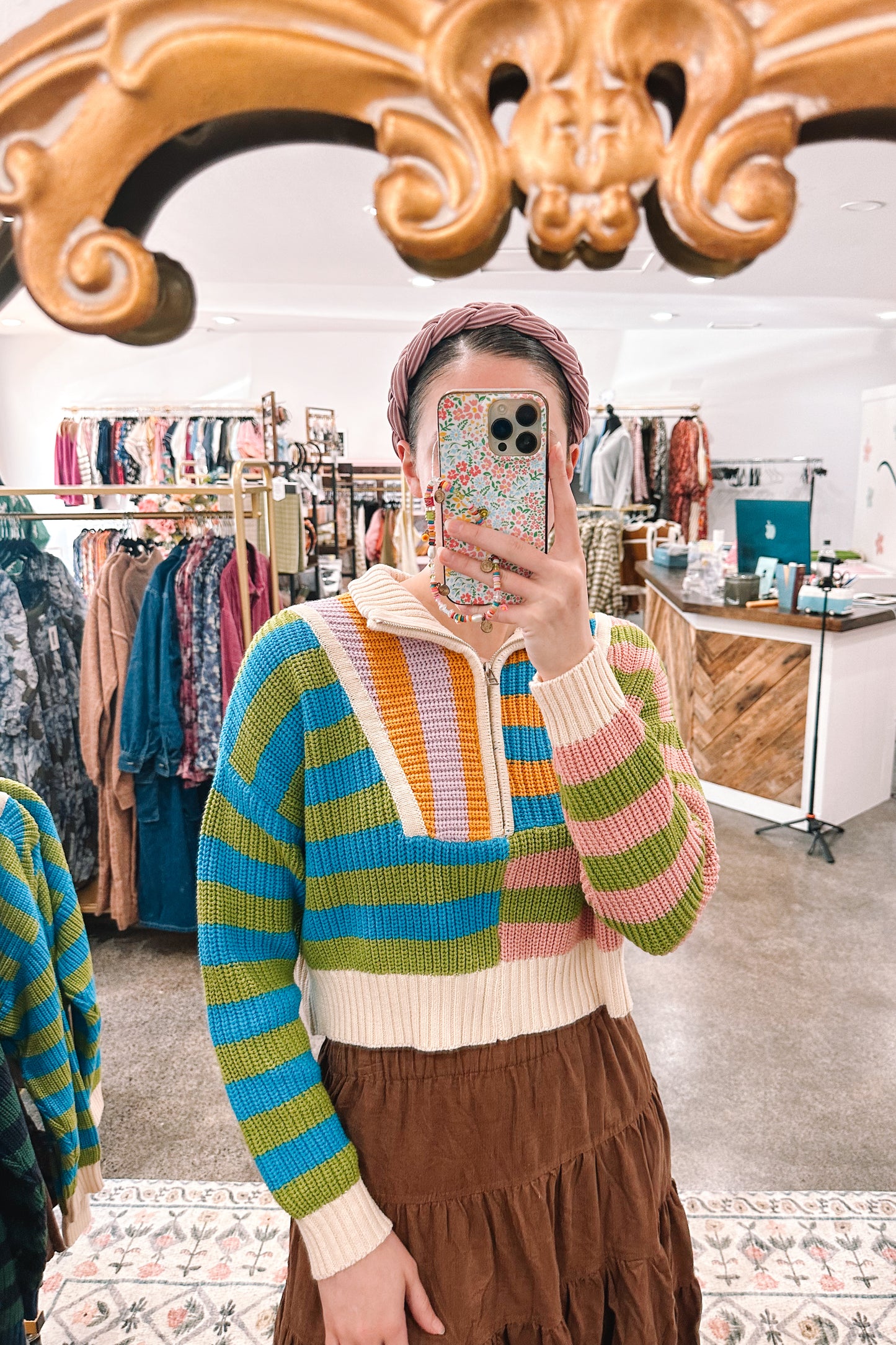 - Collared - Half zipper closure - Slightly cropped - Striped color blocks - Ribbed trims - Unlined Shell: 60% Cotton, 40% Acrylic
